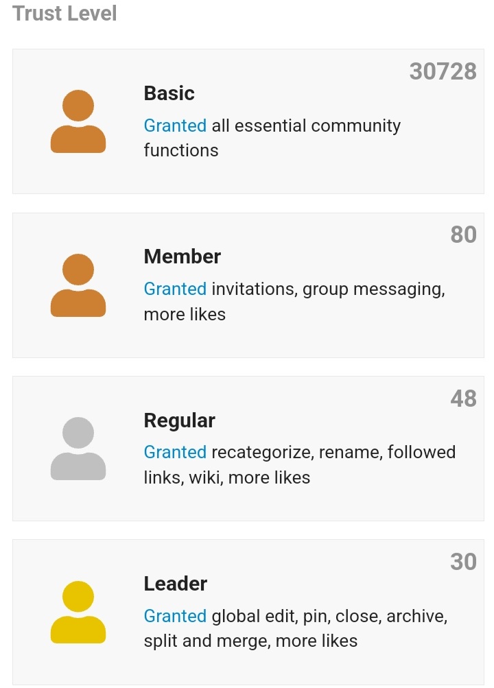The disparity between users who are basic, member, regular, and leader is quite telling. How can basic users be encouraged to go on to be users who are members, users who are regular, and selected as users who are leaders?