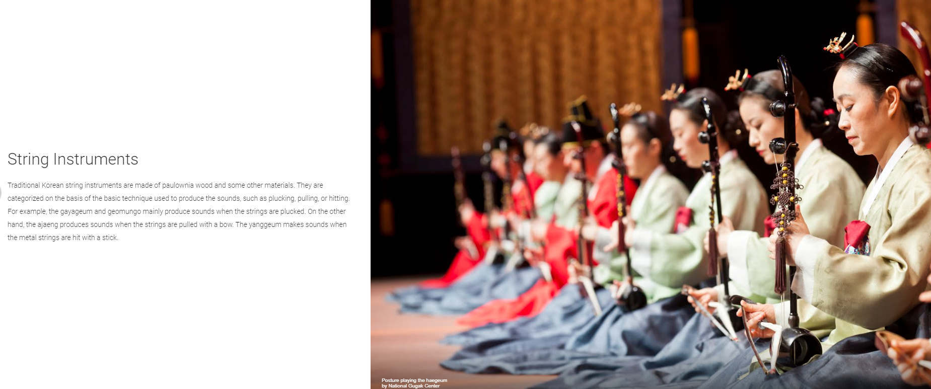 Online free exhibition of Korean instruments with pictures, a short description and sometimes a video with the sound: