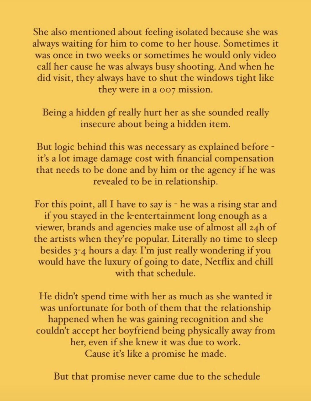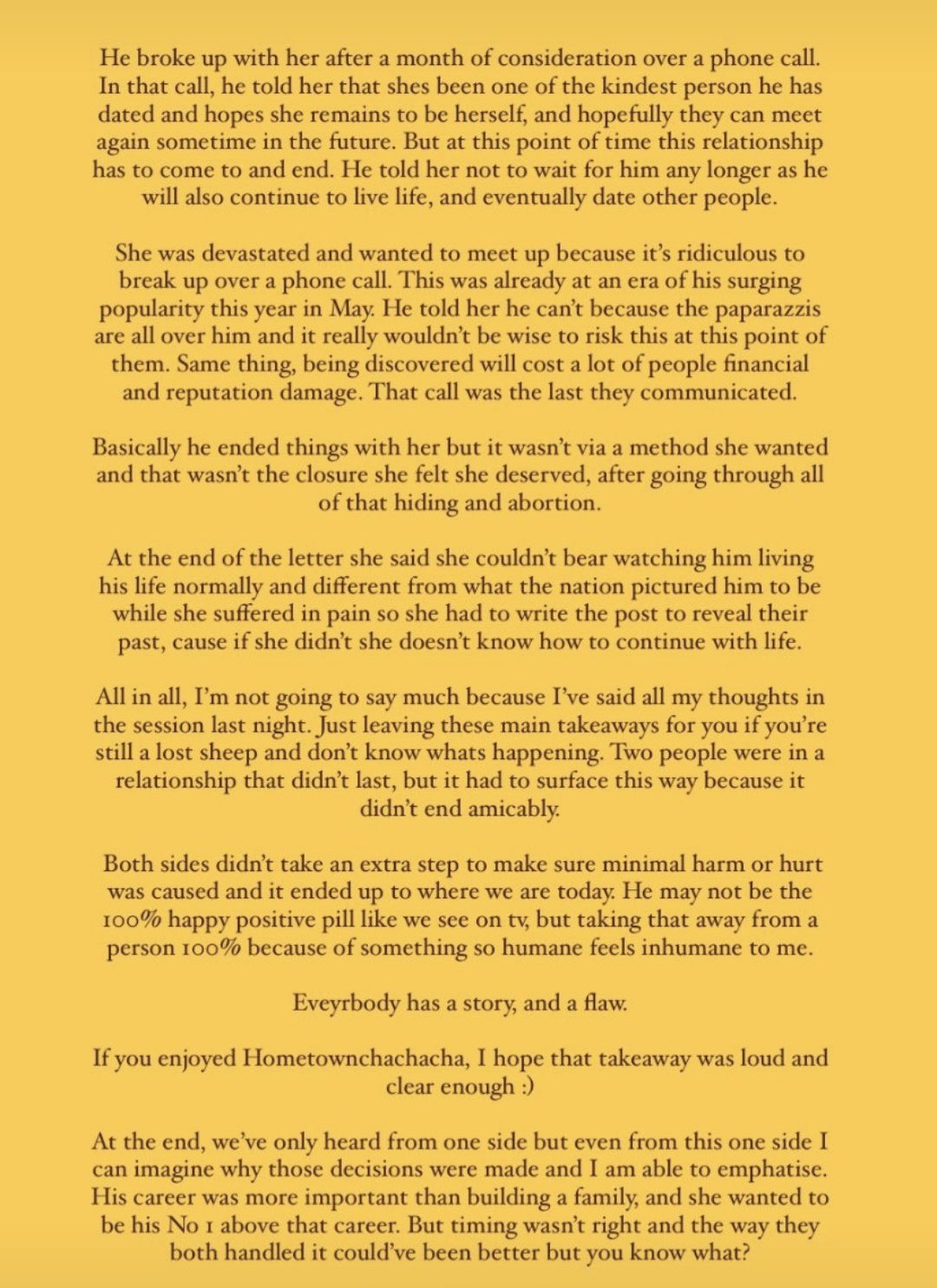 Although I am saddened at the fact that they chose to end their chance to have a family - People in Glass Houses should not throw stones! I cannot judge nor know what is happening in the minds of others. I just know that this sounds like a woman who was deeply hurt who probably still loves him and maybe even wanted to continue a relationship he no longer could with his rise in his career. Do I think that he is a narcist-jerk now, I don’t. I did at first. His apology seemed to be “I was so fearful” and I thought he was only thinking of himself. Actually, by not making excuses he has taken a HUGE FALL that I think she should have seen coming! How very SAD for him to lose everything in just “seconds” of this coming out. As an international fan, I can’t understand the “clauses” that keep these guys from dating that the fear he must have had at spending hundreds of thousands on penalties if he came out. Does that make him a bad guy? I have come full circle to believe no - he is just a human who tried to have a relationship that ended poorly with maybe some bad decisions in the mix.