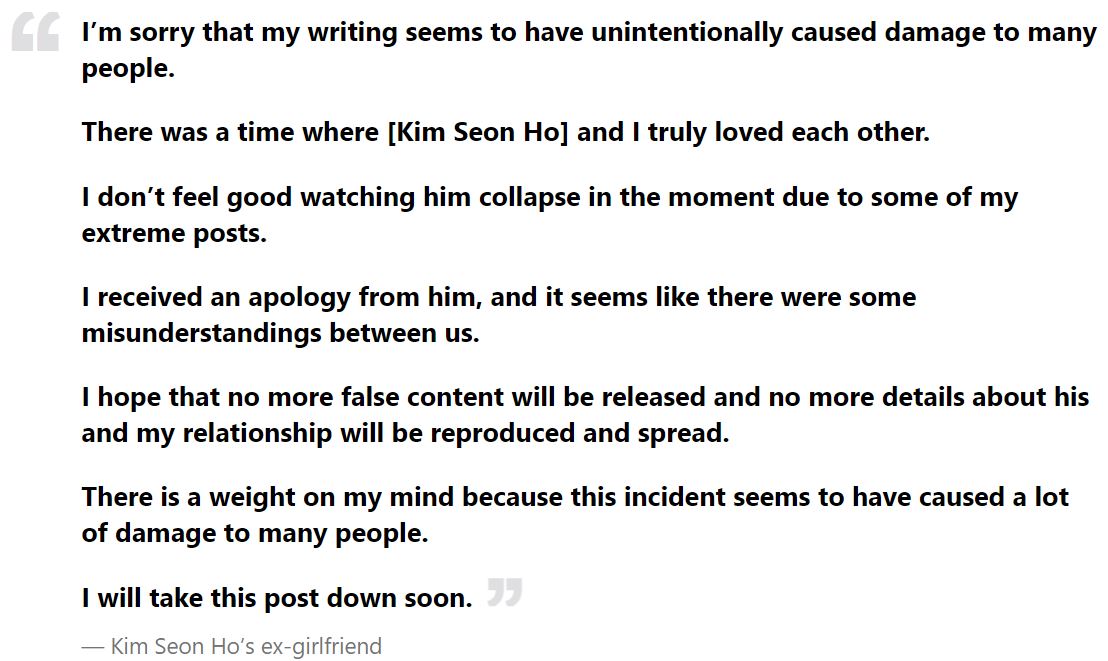 And here is the koreaboo article with her latest post, saying she’s sorry about what she did to him with her “extreme posts” and that there were “some misunderstandings”