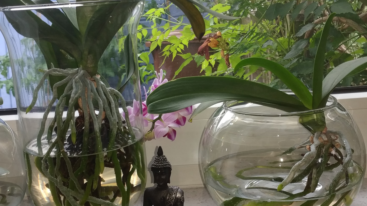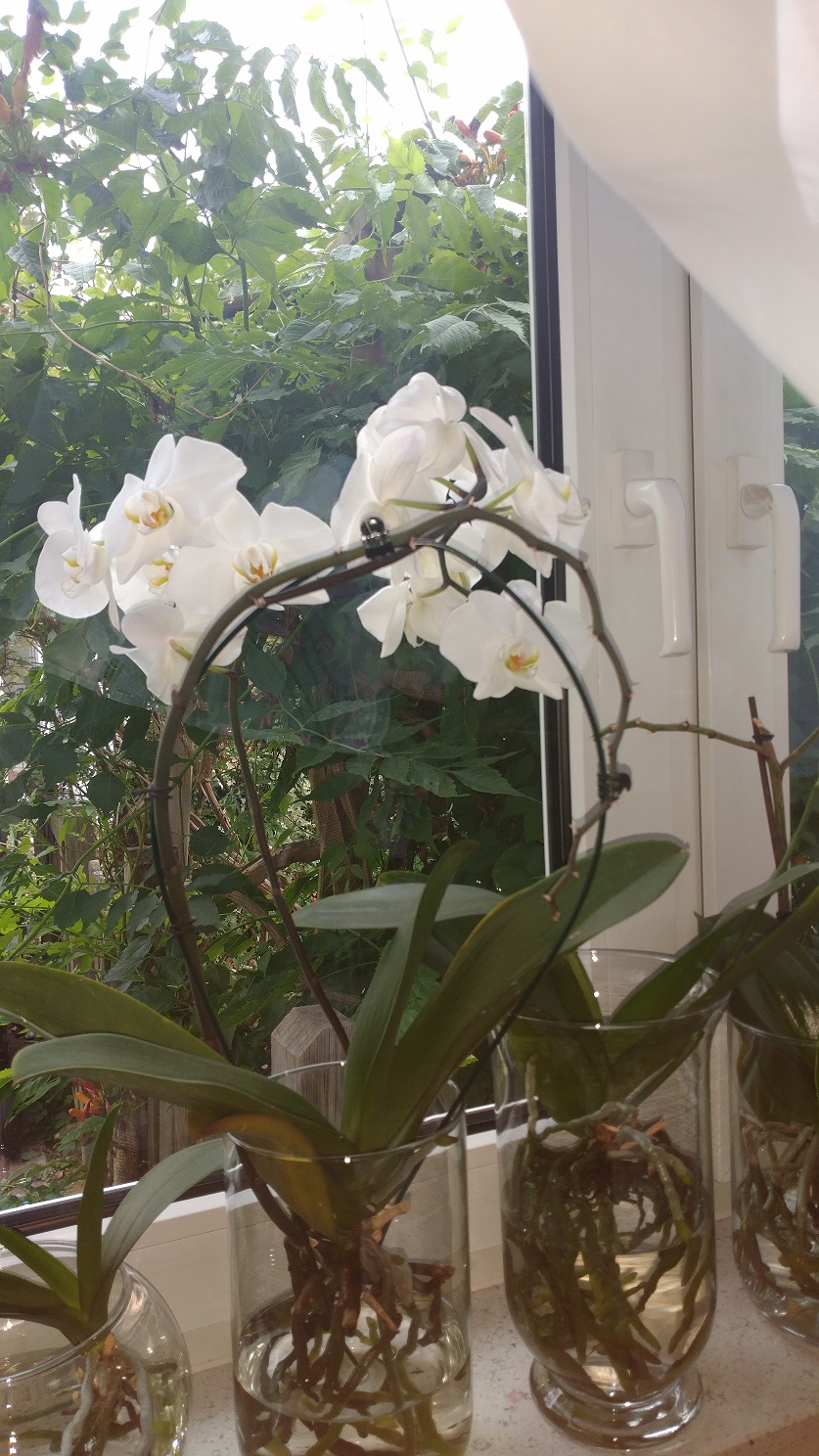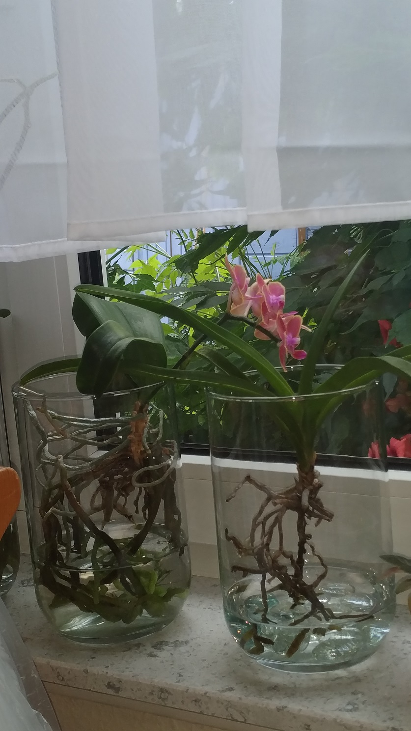 Usually I just fill up the missing water and every 5-6 weeks I change the water completely and clean the glass vases. In summer there may grow some algae, but they don’t bother the orchids, they only disturb the nice optic