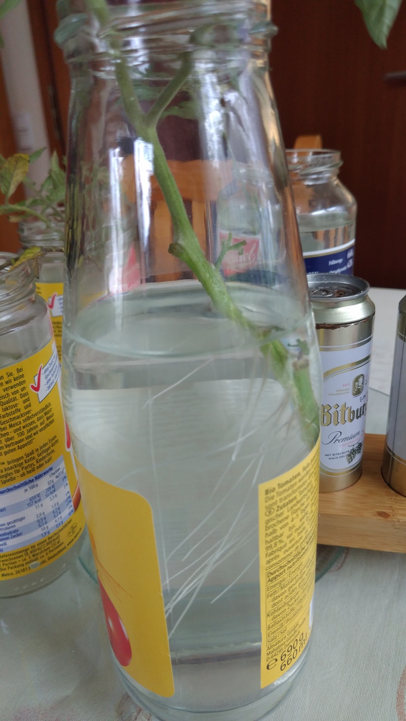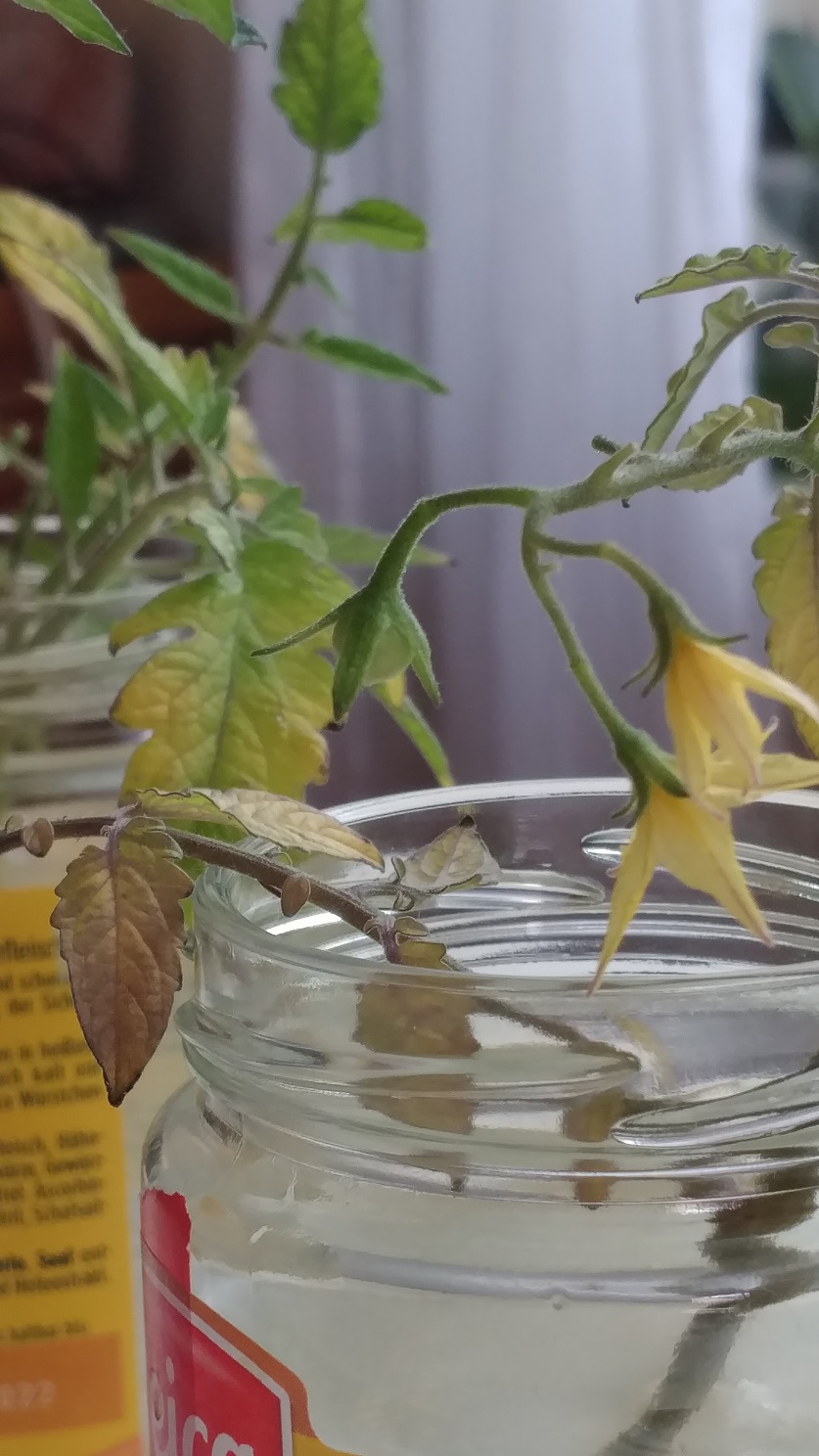 Since winter is approaching, I cut some stems from my tomato plants and I want to grow them indoor as hydroponics. They develop roots very quickly and even startet to build buds and startet blooming. Let’s wait, if they have some fruits, too. ![]()