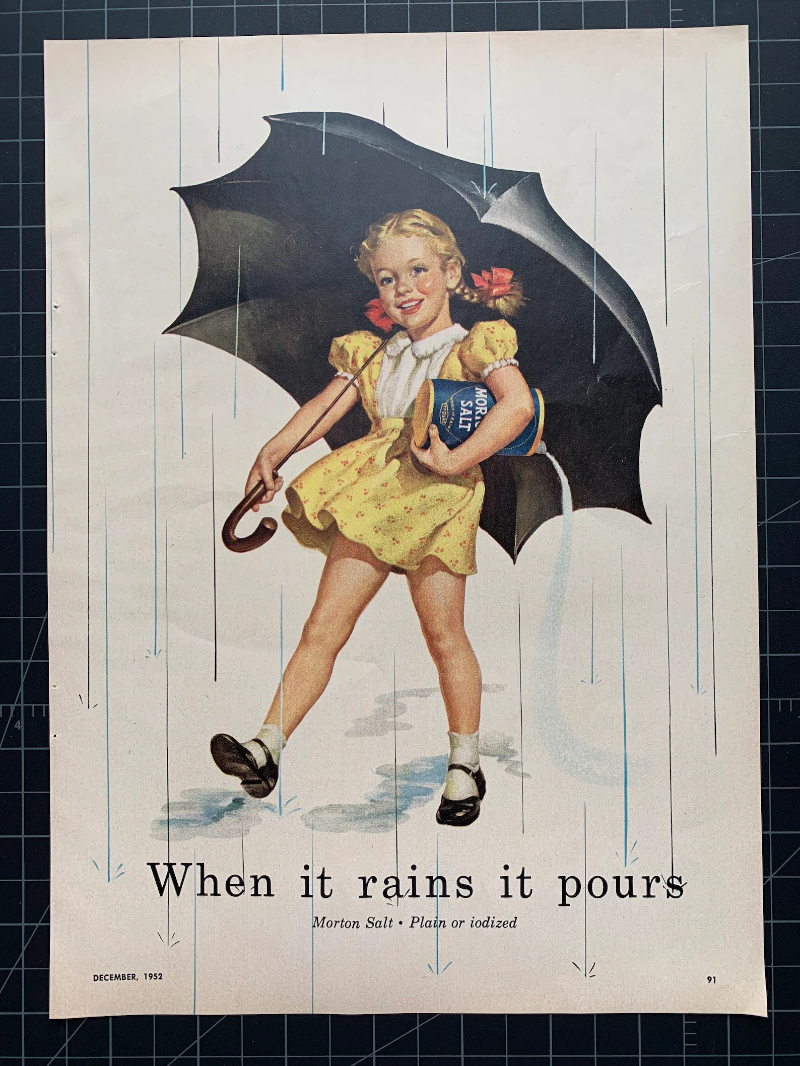 Morton Salt’s motto for decades: “When it [the weather] rains, it [the sodium chloride] pours.”
