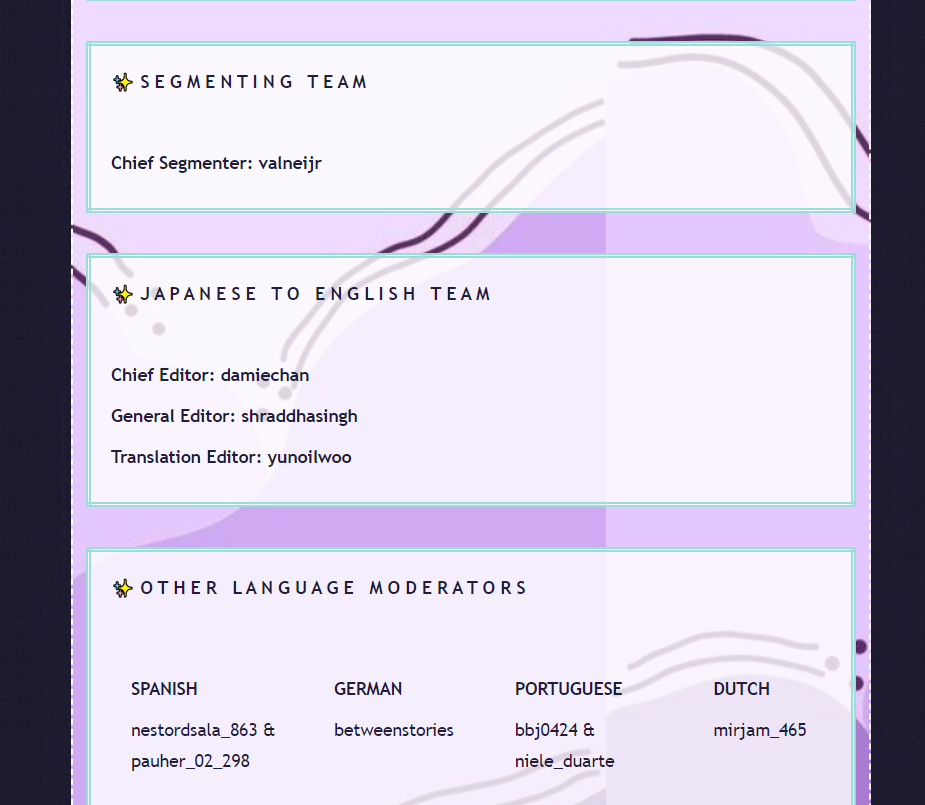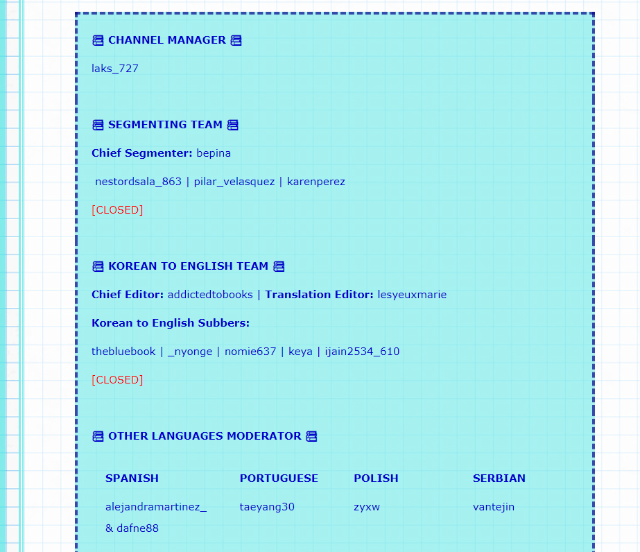 When you open a subtitle team tab, you’ll see the team members, beginning from the Channel Manager to the very first subtitler added in the team. If you find it difficult to locate a CE, scroll just below the subtitle team tab; there’ll be a very gorgeous cover page which lists the team members. Every cover page is unique, so you’ll take a few seconds before locating the CE.