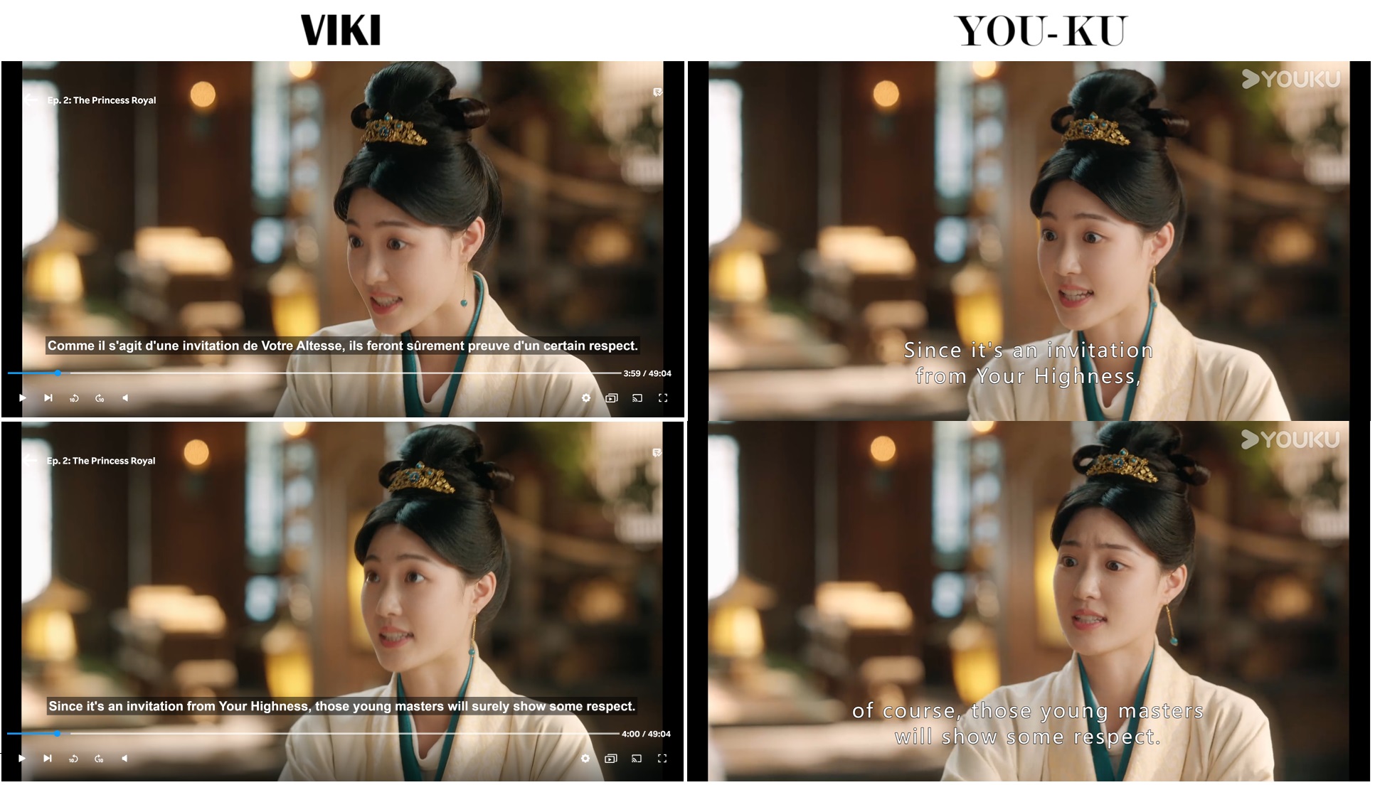Here are some screenshots from the web comparing Viki and You-Ku at the exact same moment. As you can see, whether in English or French, Viki’s subtitles span the entire screen with no breaks.