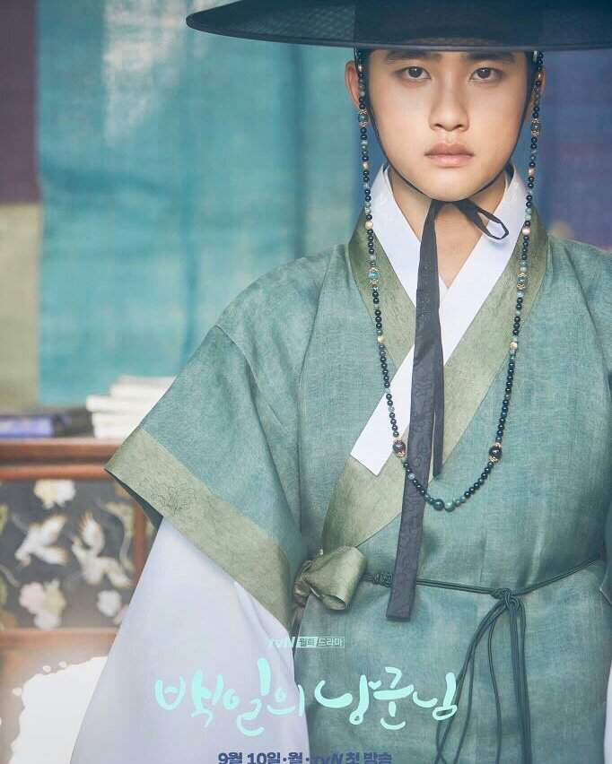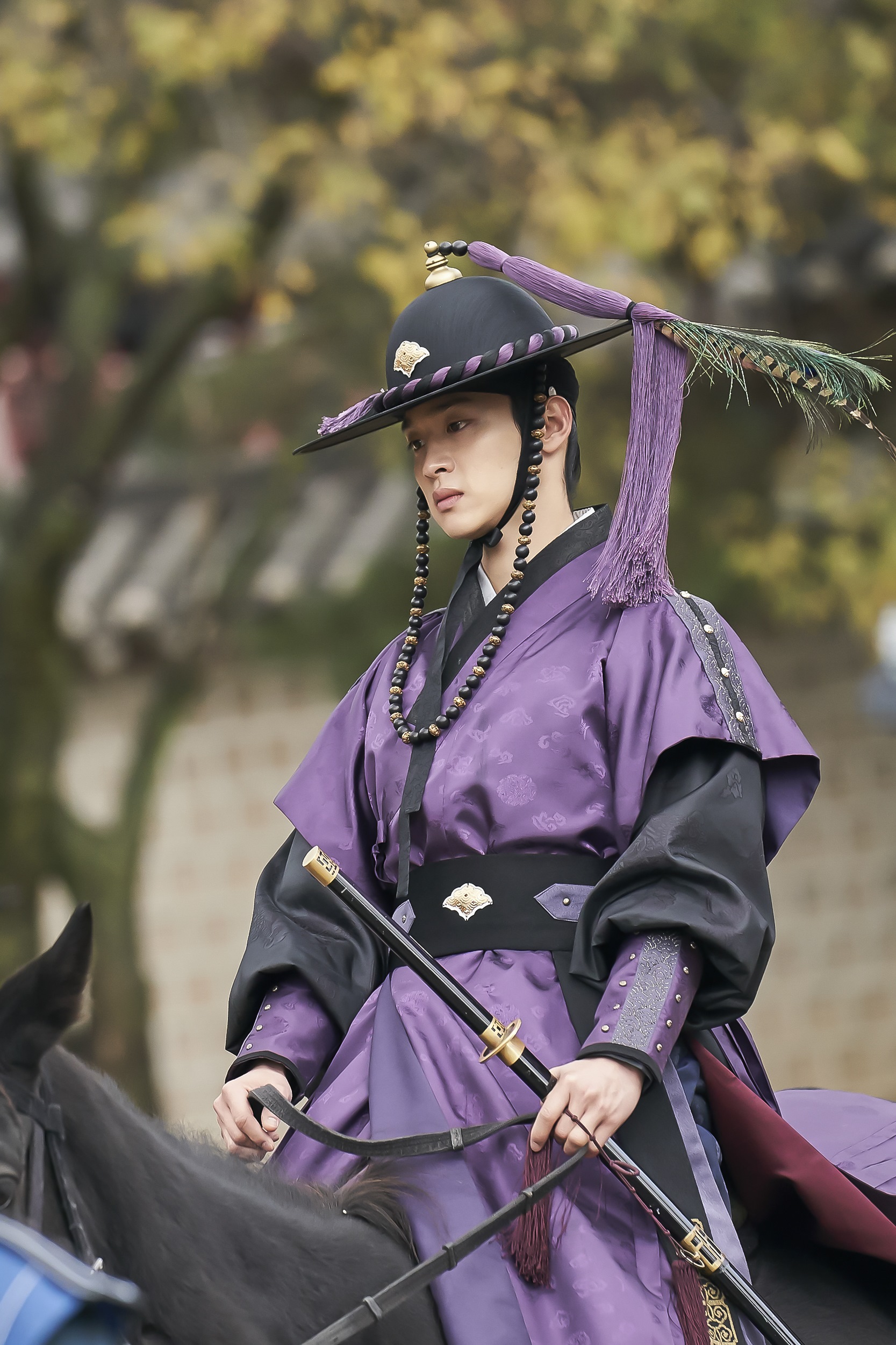 I really like the light blue-green to sage contrast on his hanbok. It has just a touch of jacquard on that sage. And I can’t quite tell from the picture but the blue-green looks a little slubby textured like shantung. But it may just be the weave…