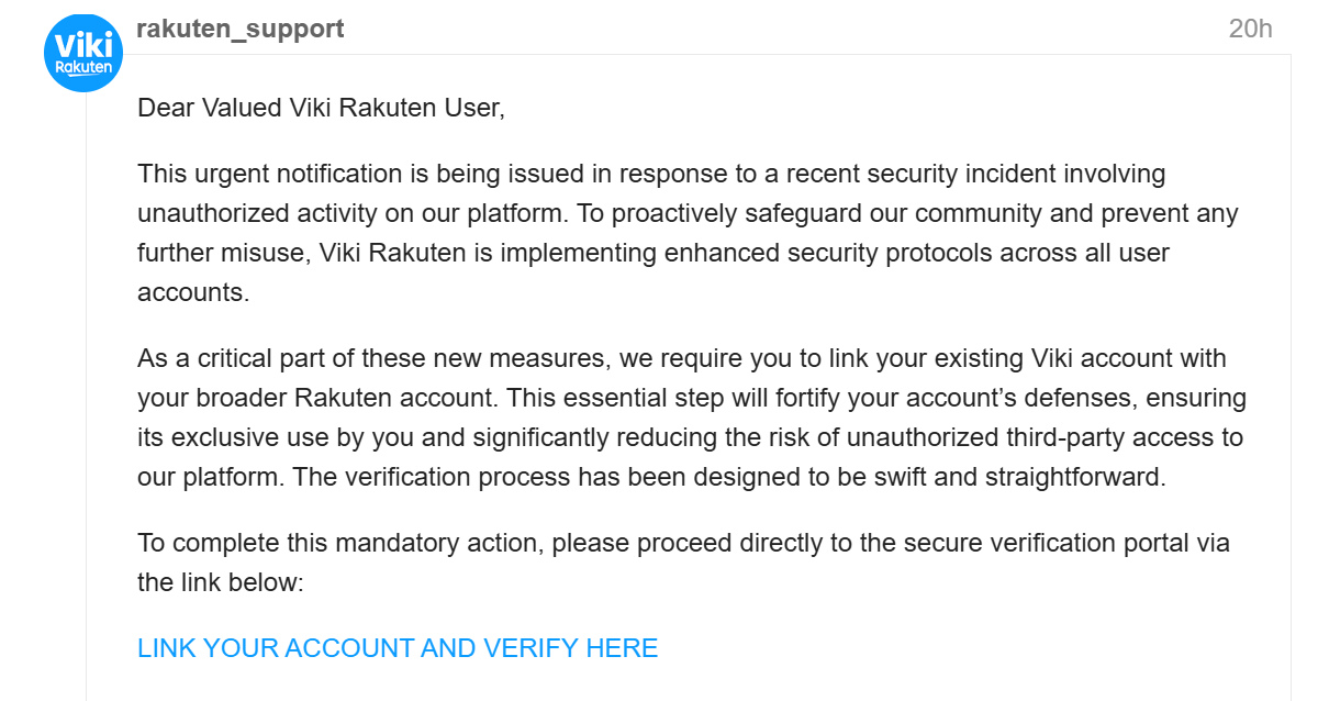 There was another Thread in Discussions about this topic, but it has disappeared today. Thank you for posting about your message because it is different from the one I got. I received a similar message in my Discussions from account called rakuten_support. My message was different. I can’t do screenshot but here is the message I received.