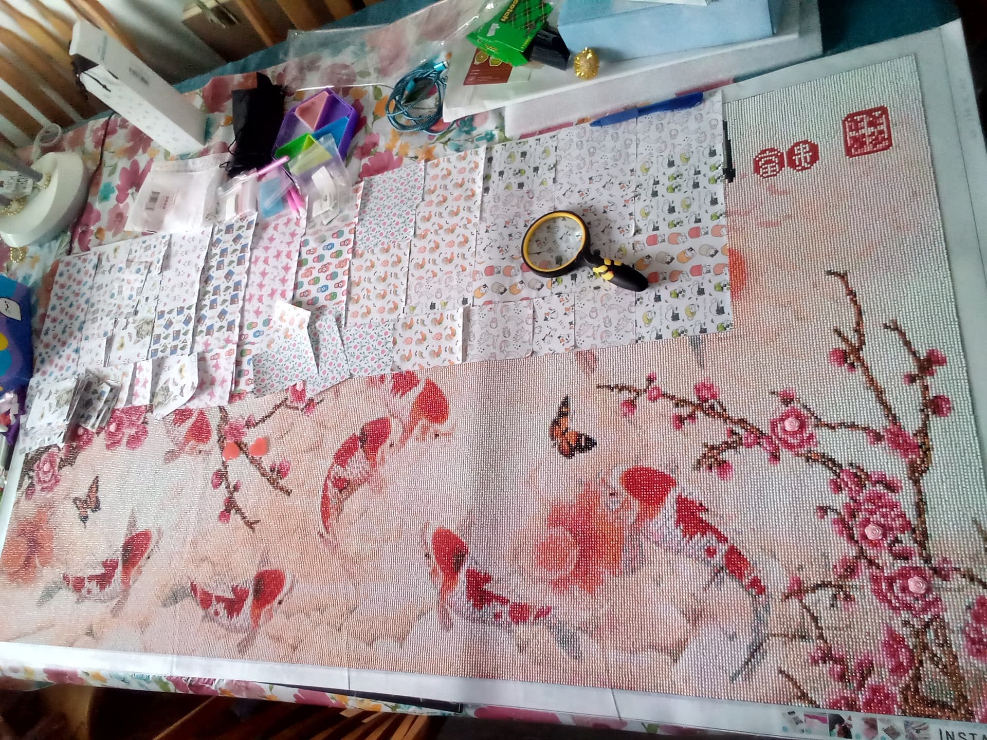 I have been showing my avatar only a few hours a week since New Years because I have been working on a huge diamond art project. My 9 koi pond. This is my progress until March 1. It is 4.5 by 2.5 feet
