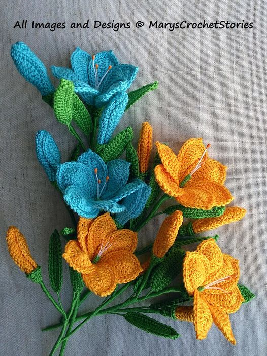 Crochet Lilies in blue and yellow.