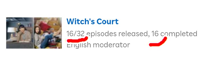 Witch’s court is 100% completed in English and it ONLY has 16 episodes but for Viki system it has 32 episodes… So this is now being considered incomplete because of those 16 inexistent episodes and it’s seriously affecting all moderators.