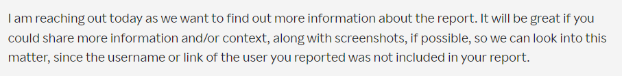 And it’s the case where I pressed the report button, so you should have the username. I also attached the screenshots by adding them in the help center as a continuation of the report.