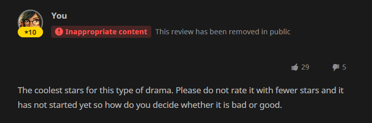 And when I flag it’s nothing personal against any user, I just hate those none reviews because then the rating will be inaccurate and sometimes it depends on a rating wether or not I watch a Kdrama (but obviously I do not check viki ratings for that) so it’s not handy when a really good Kdrama is rated as a 6 due impatient people who cannot wait for subs. Or a bad Kdrama rated as a 10 because there is an idol in it and their fanbase gave it a 10 because of that mere fact.