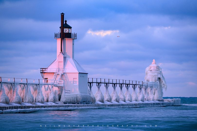The St. Joseph Lighthouses set aglow in glorious light at sunrise.